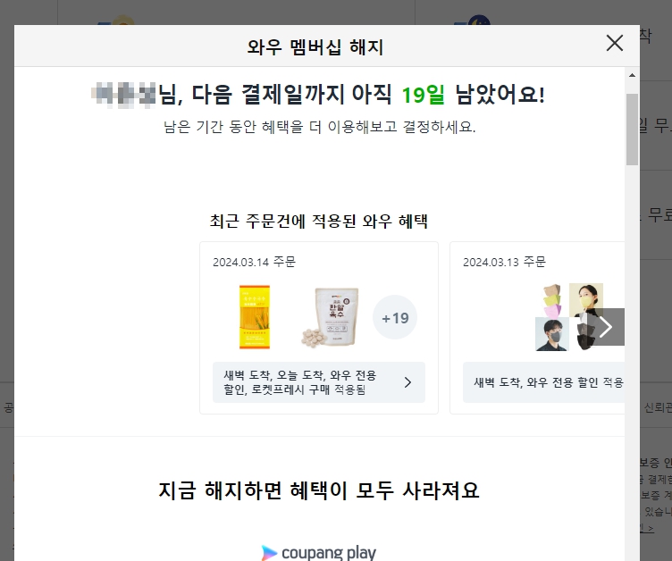 쿠팡 와우 멤버십을 유지하고 있습니다.