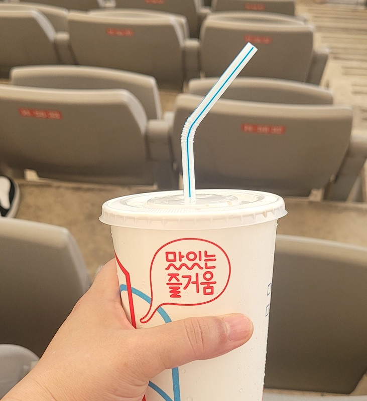 경기가 저녁시간에 진행되다보니 미리 이른 저녁식사를 했어야 했는데요. 서울 월드컵 경기장역 1번출구에 있는 홈플러스에 롯데리아가 있어서 1시간이나 줄을 서서 테이크 아웃으로 햄버거를 주문하고, 콜라를 다 마신 컵에 미리 준비해간 생수를 담아갔습니다. 왜냐하면 뚜껑이 있는 물병이나 텀블러는 서울 월드컵 경기장 반입 금지 품목이라서 뚜껑을 제거한 후 물병을 들고 들어와야 하는데, 쏟을 위험도 있고, 바닥에 놓기에는 잘 쓰러질 것 같아서 비교적 안전한 테이크아웃 컵을 이용했는데 아주 편했습니다. 뚜껑이 있어서 잠시 넘어져도 물이 쏟아지지 않아서 좋았고, 안전했어요.