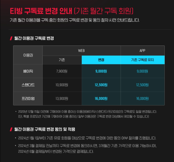 티빙은 2023년 12월 1일 이용권 개편으로 인해 구독료가 인상되었습니다.