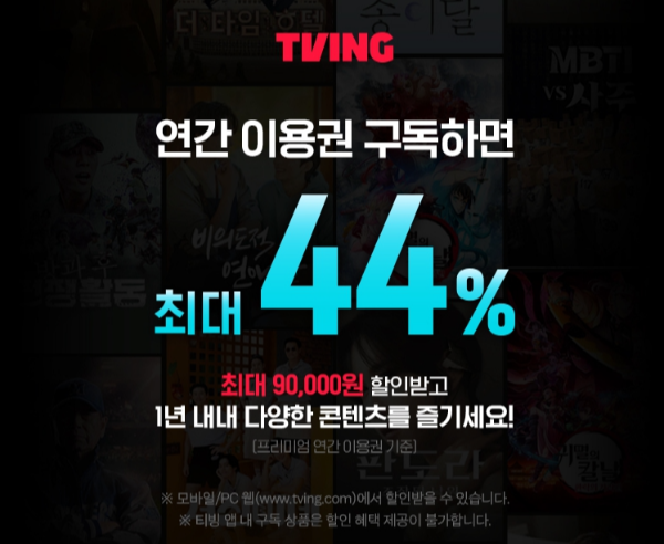 - 티빙 프리미엄 이용권 기준으로 연간 이용권을 구독하면 최대 44%, 90,000원을 할인받을 수 있습니다.