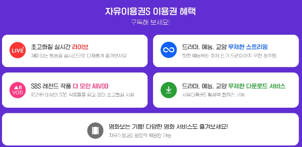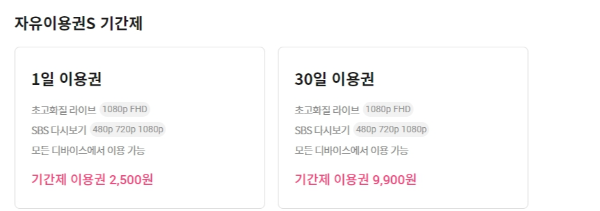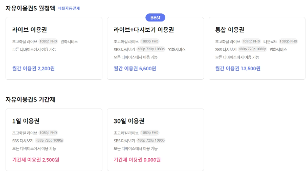 | 라이브+다시보기 이용권 | 6,600원 | 초고화질 라이브 1080p FHD, SBS 다시보기, 영화서비스, 모든 디바이스에서 이용가능 |